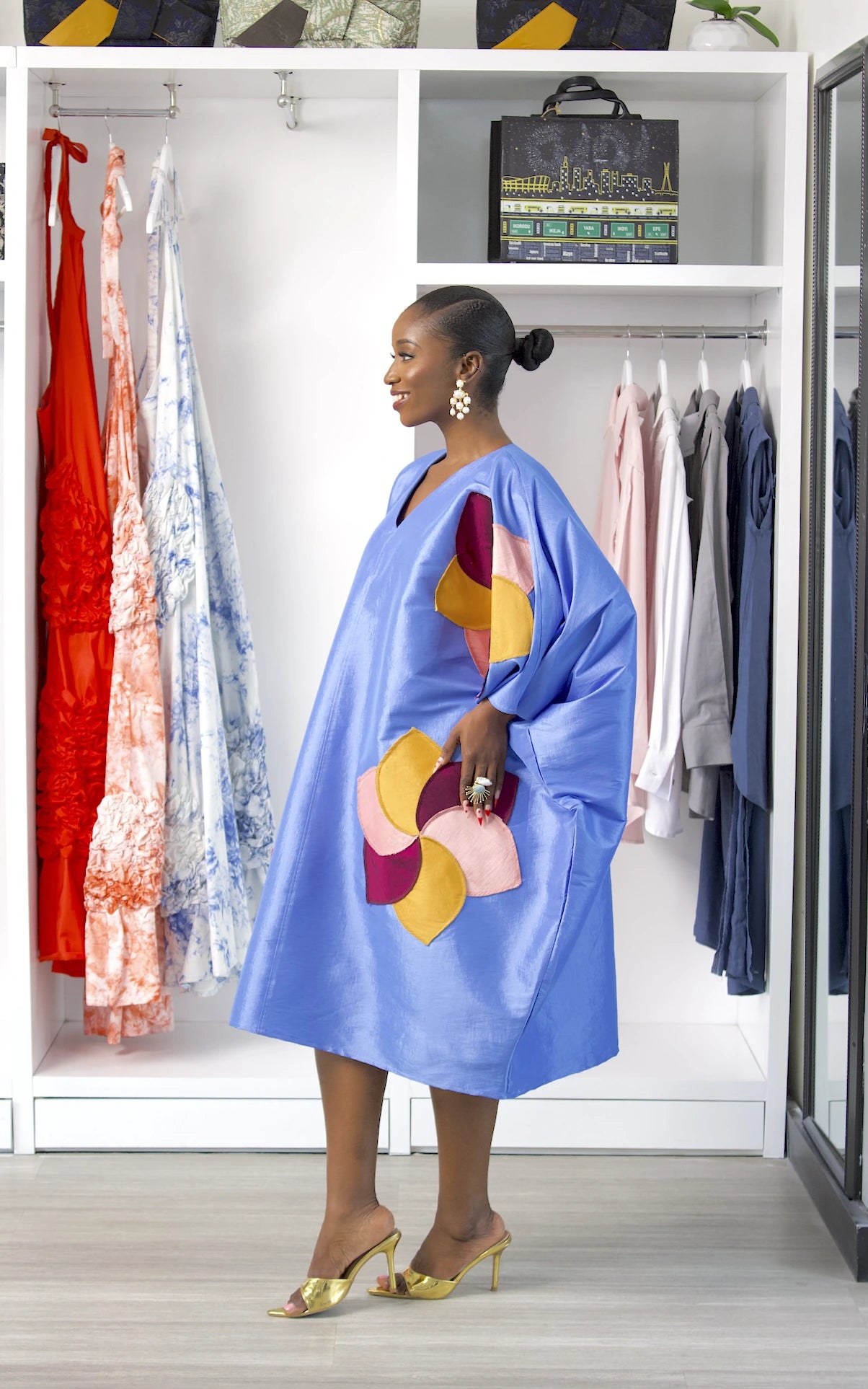 V NECK MIDI TAFETTA KAFTAN WITH CONTRASTING PATCHWORK FLOWER DETAIL